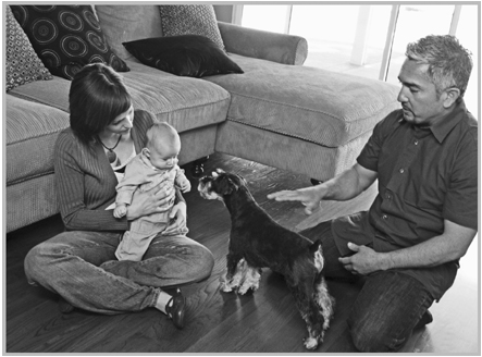To demonstrate how to introduce a puppy to an infant or very young child, I asked Dog Whisperer field producer Todd Henderson to lend me his wife, Lindsey, a vet tech and experienced dog owner, and their new son, Hunter, just three months old. The wonderful thing about both a puppy and a baby is that each starts with the advantage of not having any issues. Our job is to help them to grow together with that same mentality.